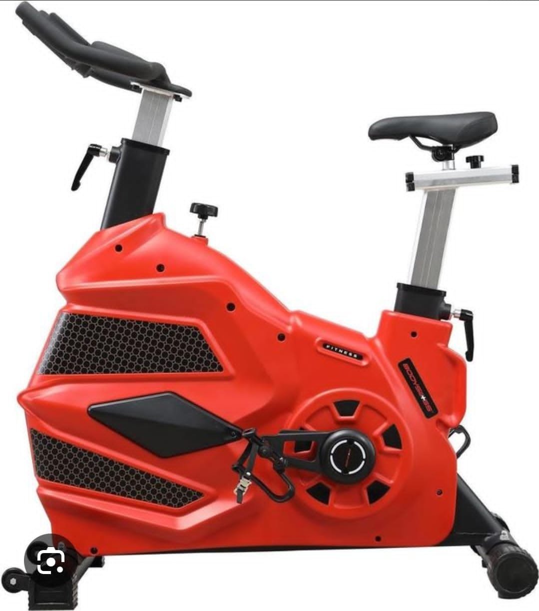 Red commercial spinning bike with a bold, motorcycle‑styled design. Features an adjustable black seat, silver‑framed handlebars, ventilation panels, and a front control console . Built for high‑intensity gym workouts and professional spinning classes. Ideal for endurance training and cardio sessions.